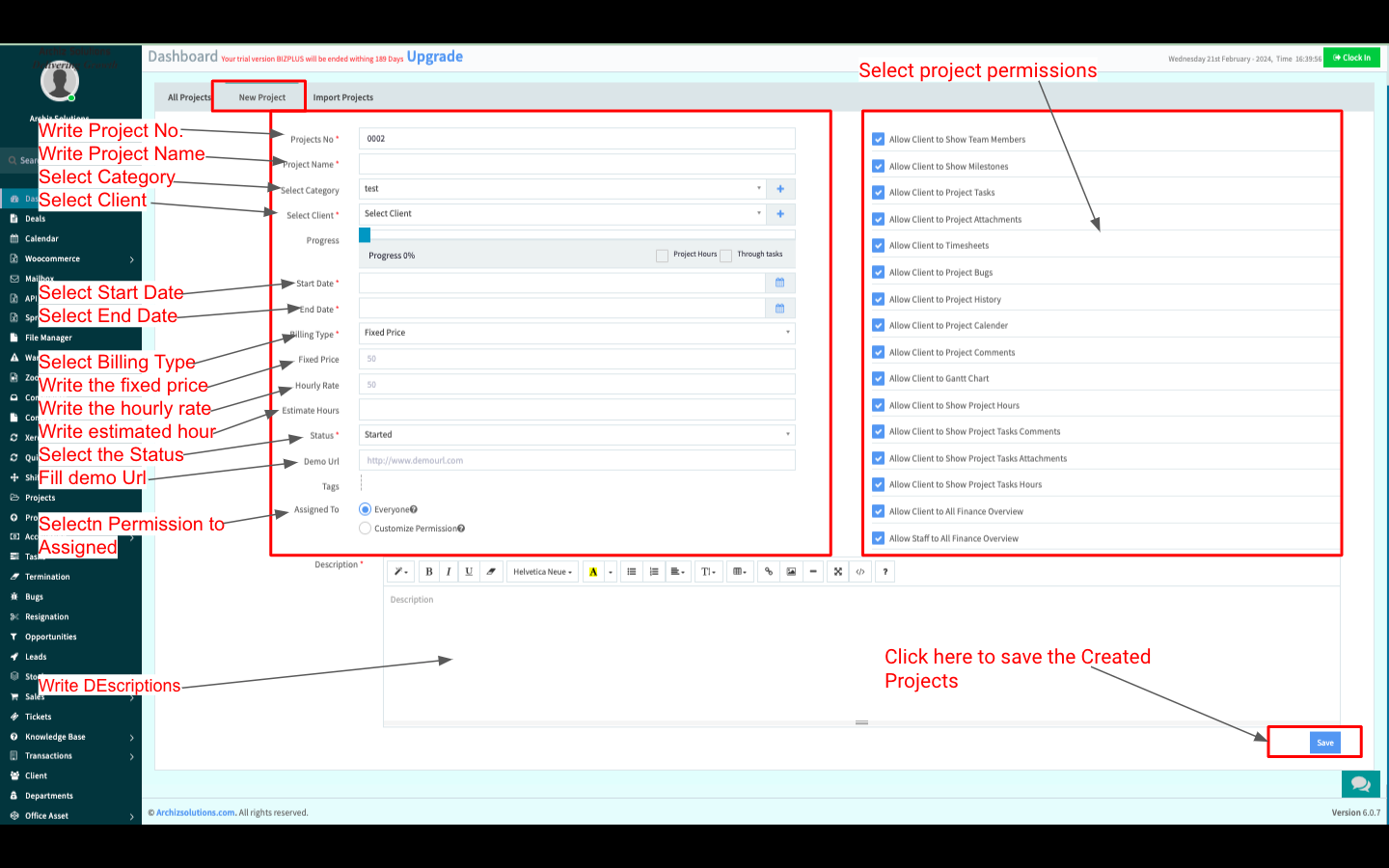 You can create a new project by clicking “New Project”. Fill up project info: Projects No., Project Name, Select Category, Progress, Project Start Date, Project End Date, Billing Type, Fixed Price, Estimate Hours, Project Status, Demo URL, Tags, Assigned To. Progress has three types: Project via Percentage, Project Hours, and Through Tasks. Project Progress via Percentage is selected by default. Select your project permissions, enter the project description, and click “Save” to save the project.