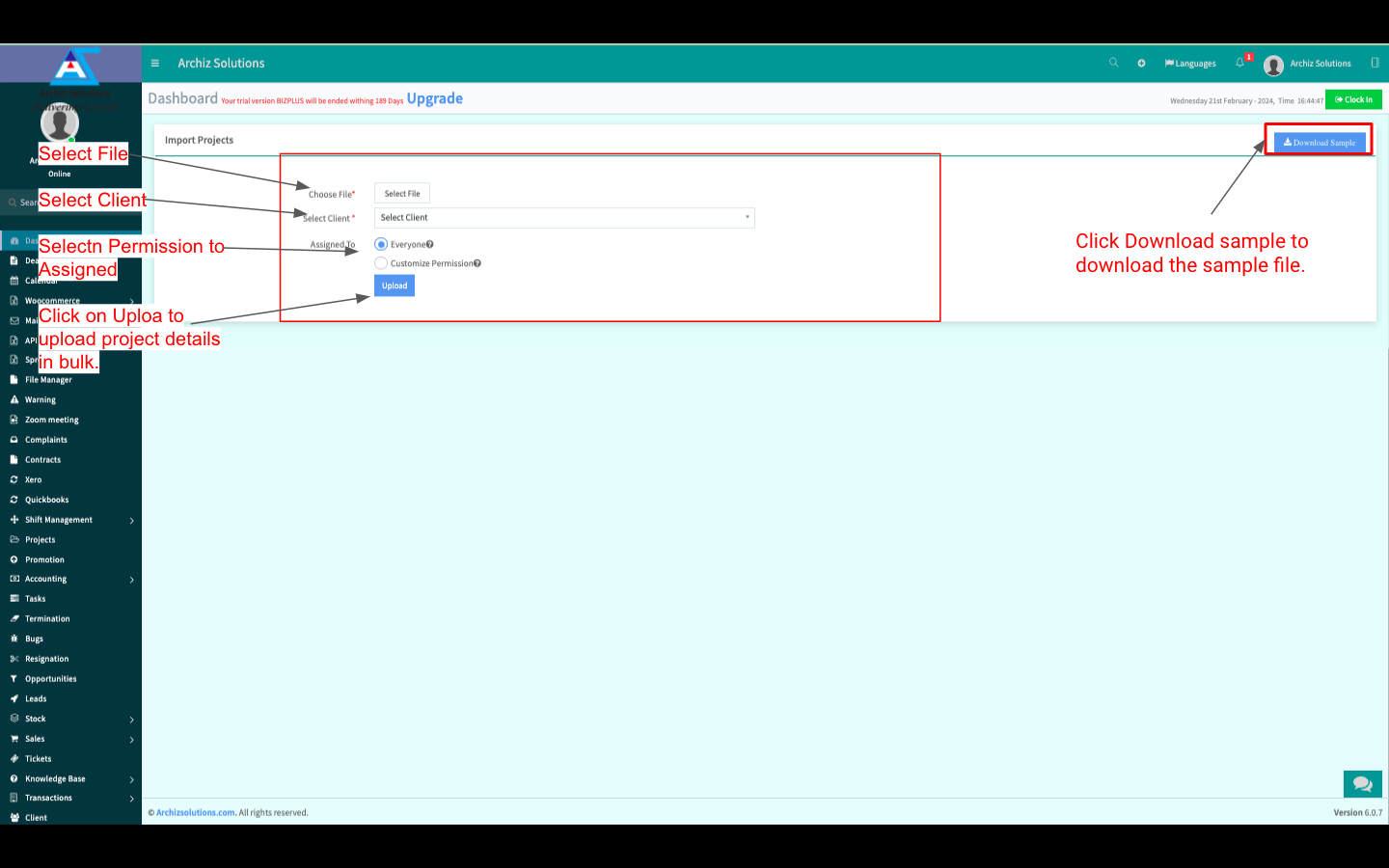 You can upload an existing project from your local storage from “Import Project”. Select Project File (XLSX or CSV File Only), Select Project Client, Choose Assigned To and click “Upload” to import the project.