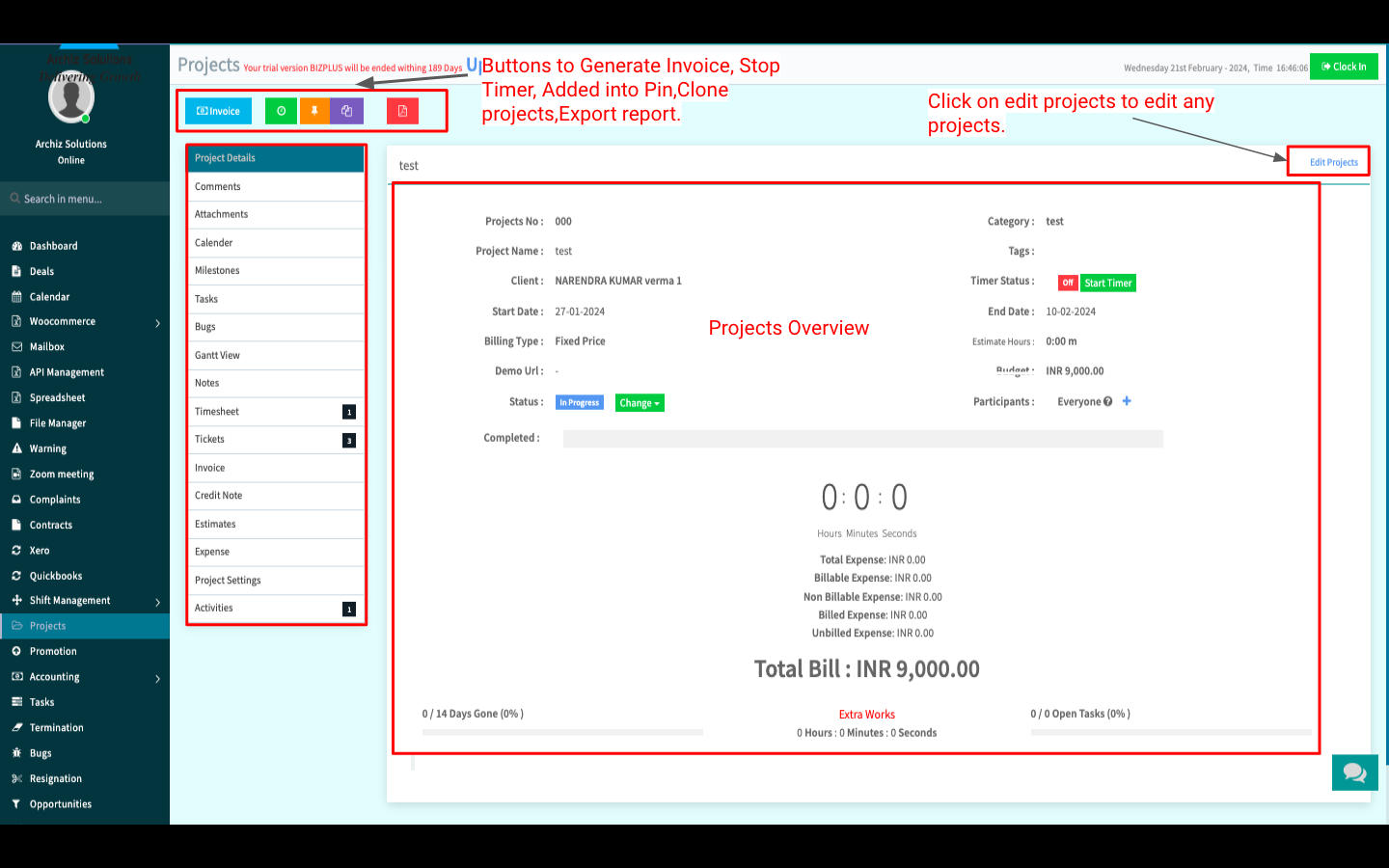 You can see Project Details, Calendar, Comments, Attachment, Milestones, Tasks, Bugs, Gantt View, Notes, Timesheet, Tickets, Invoice, Credit Note, Estimates, Expense, Project Settings, and Activities in the “Project Details” Menu.