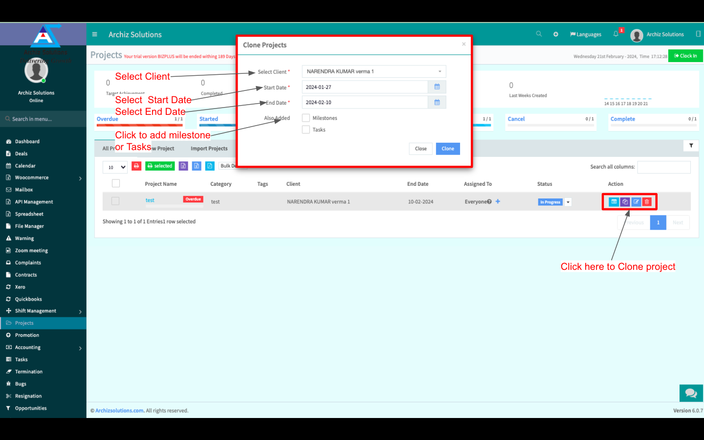 You can clone an existing project by clicking “Clone” Action Button. Select Project Client, Project Start & End Date, Add Milestones & Tasks, and click “Clone” to clone the project.