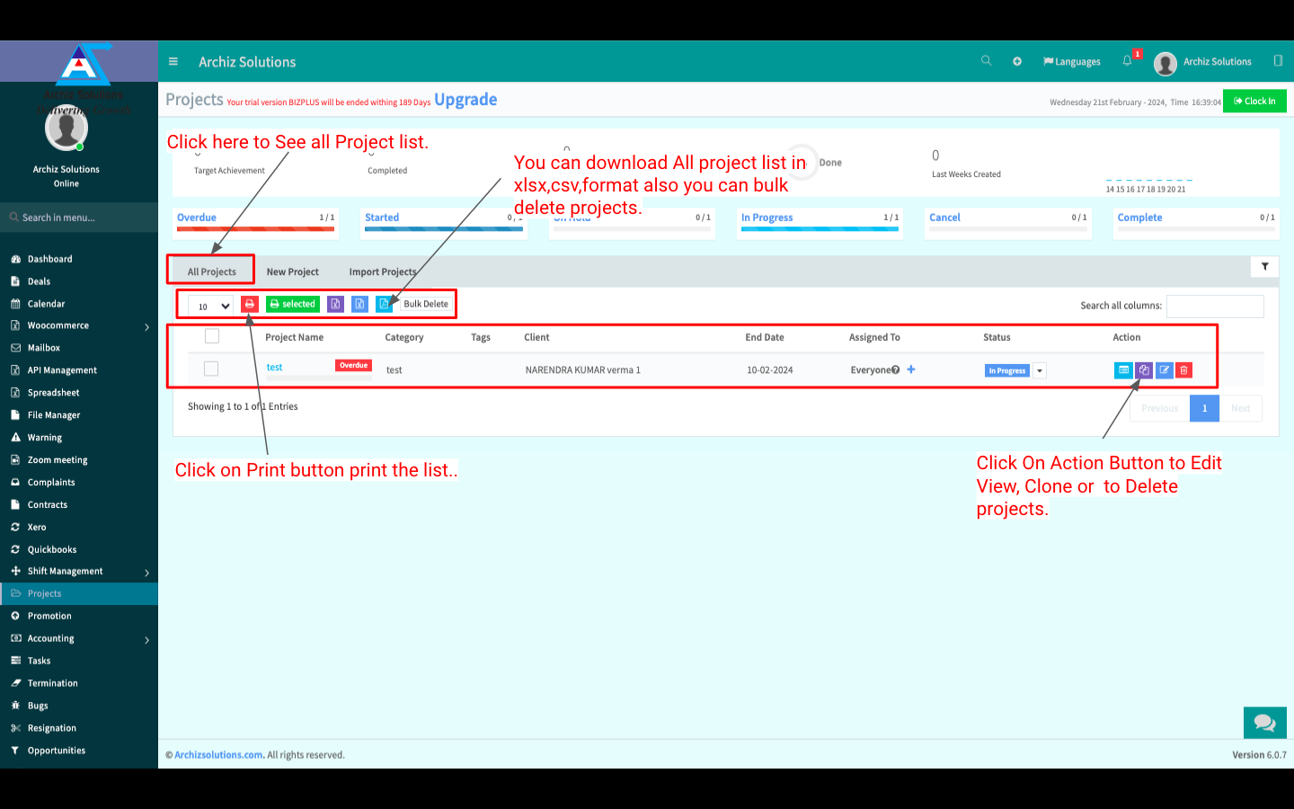 In the “Projects” menu, you can see Project Name, Category, Tags, Client Name, Project End Date, Assigned To, and Project Status. You can change Project Status to Started, In Progress, Cancel, On Hold, or Completed. Click the “Action Button” to View, Clone, Edit, or Delete an existing Project.