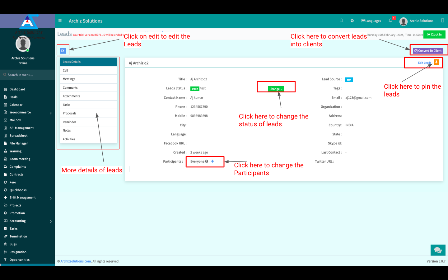 You can view more details by clicking on the Lead Name. You can Convert the Lead into a Client and change lead status. You can also Edit the Lead.