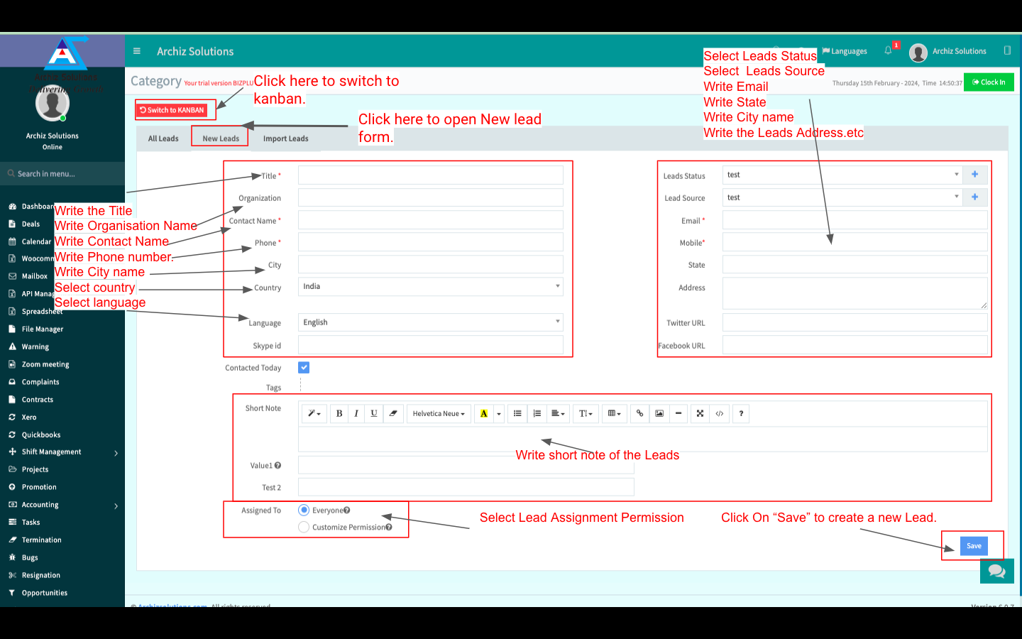 You can create a New Lead by clicking on “New Leads” beside “All Leads”. Fill up all info and click “Save” to Save the New Lead.