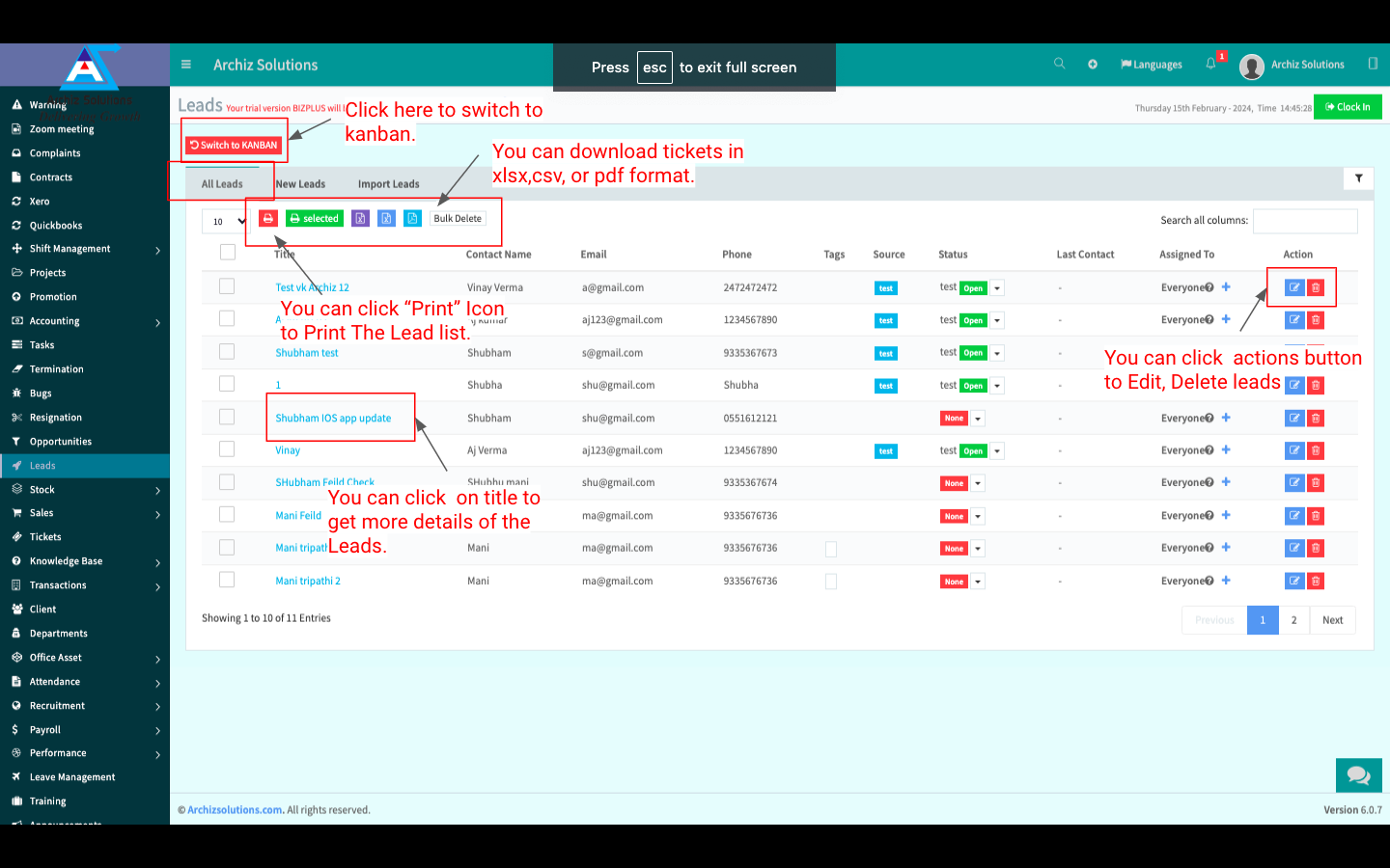 The Leads menu is displayed in List Mode, you can switch to KANBAN Mode. You can create New Leads, Import Leads from your local storage, Print or Download Leads in XLSX, CSV or PDF Format, view more details, Change Lead Status, and Change Lead Assigned. You can also Edit or Delete an existing Lead