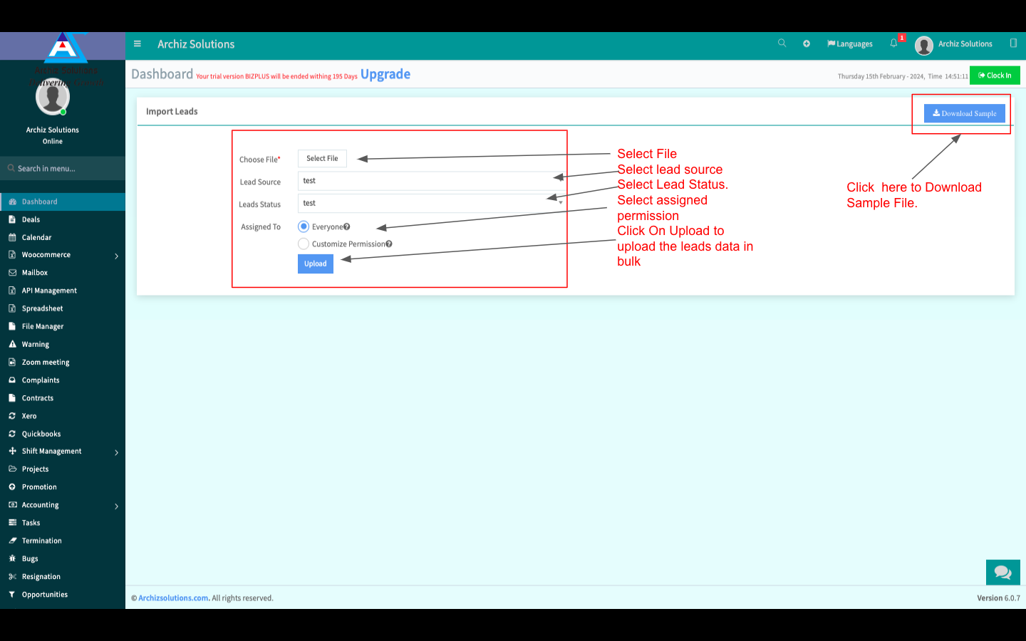 You can Import Leads from your local storage by clicking on “Import Leads” beside “New Leads”. Select the Lead file (XLSX, CSV format only) and click “Upload” to Upload the selected Lead file.