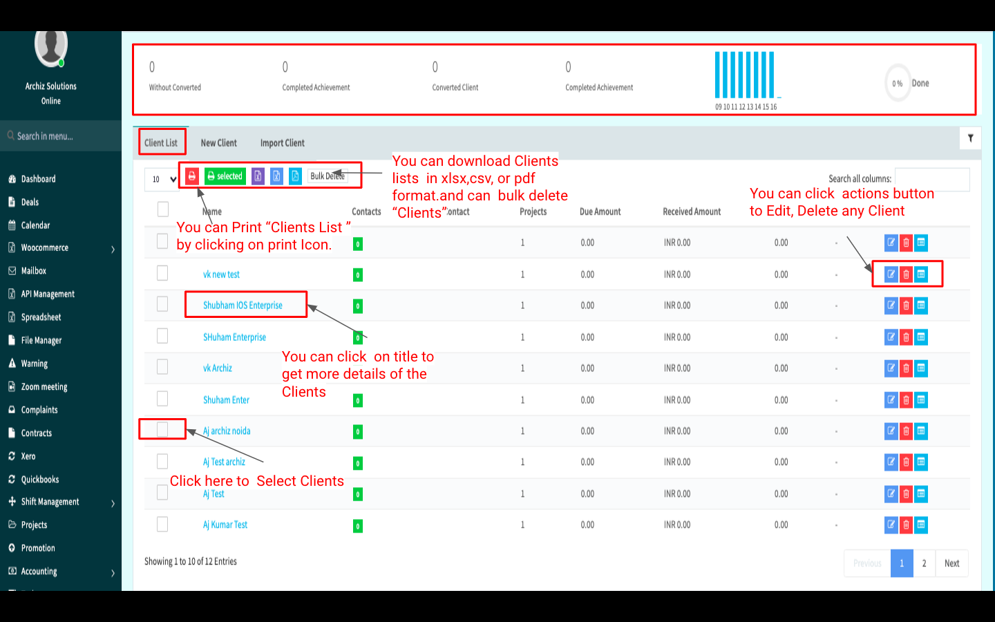 Click “Client” menu to see all Client, Create Client, Edit Client, Delete Client, Export, Import, Print, and Client details.