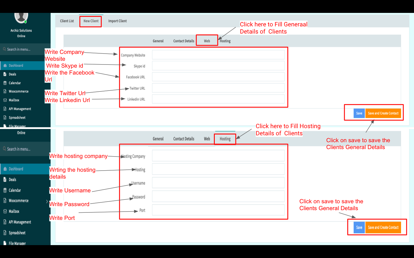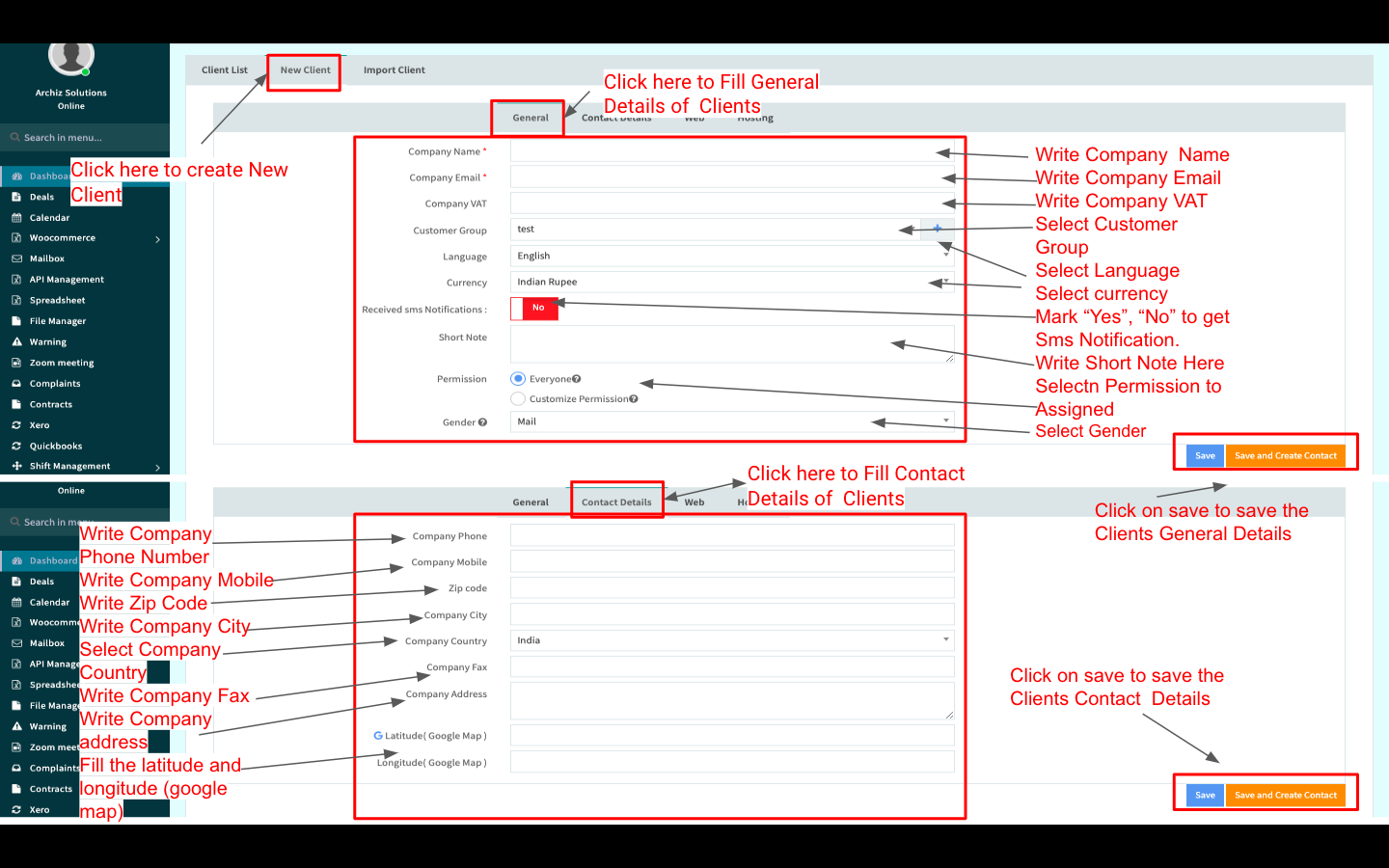 You can Create a New Client by clicking “New Client” besides “Client List”. Fill up all info and click “Save” to Save or click “Save and Create Contact” to Save and Create Contacts for this client.