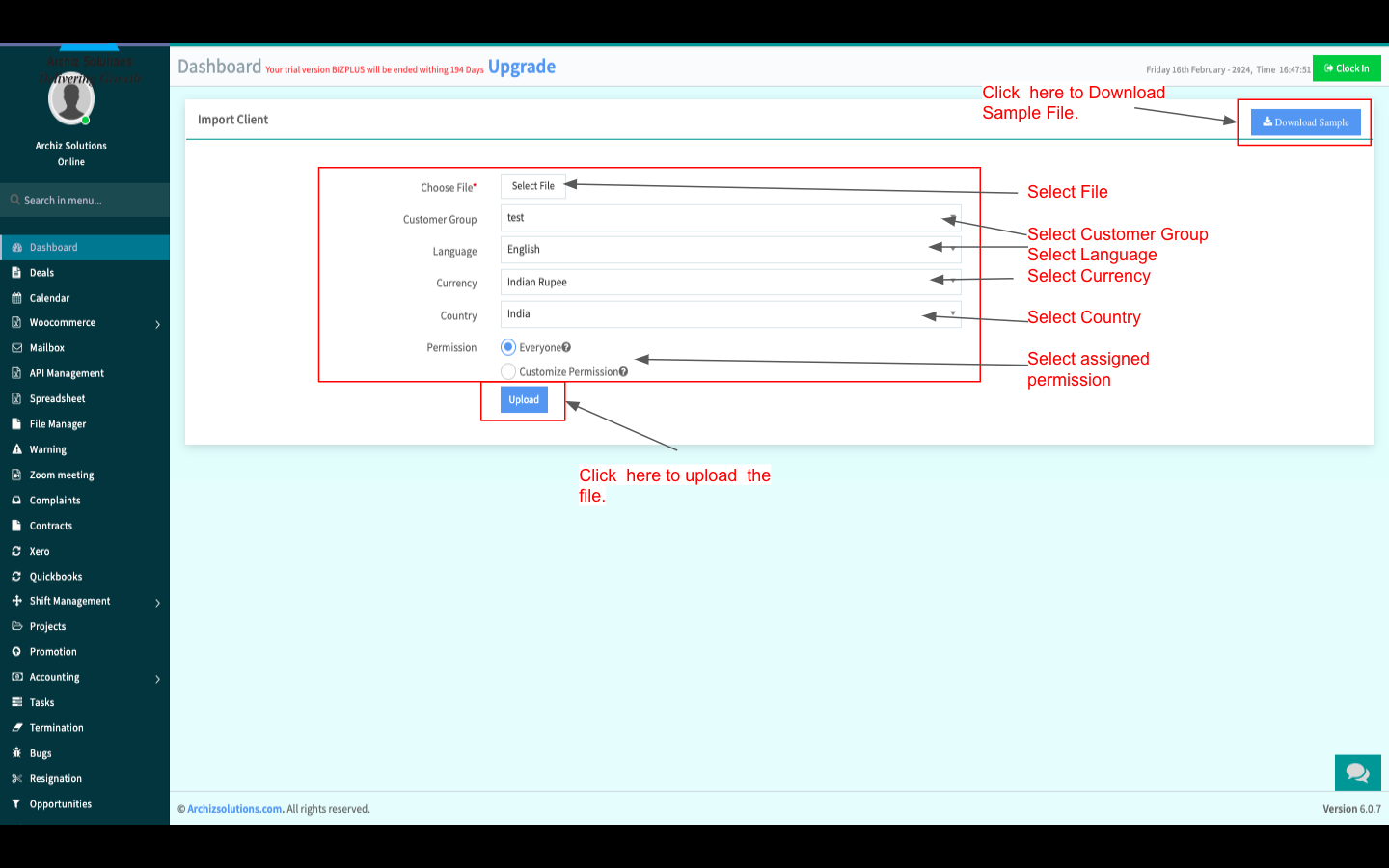 You can Import Client from your local storage by clicking on “Import Client” beside “New Client”. Select Lead file (XLSX, CSV format only), fill up all info and click “Upload” to Upload the selected Client file.