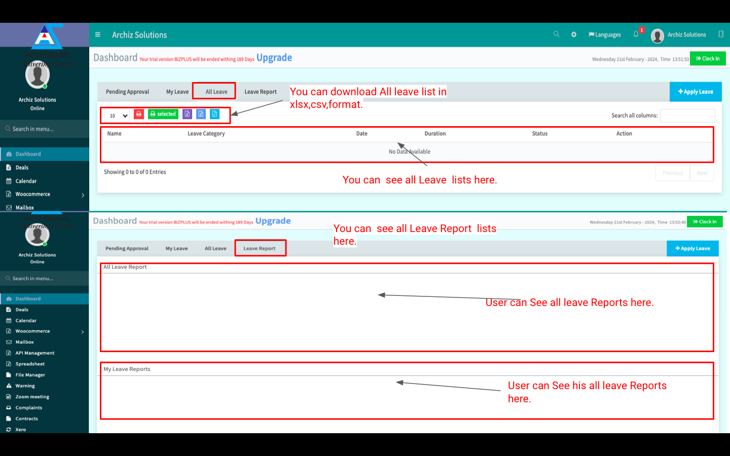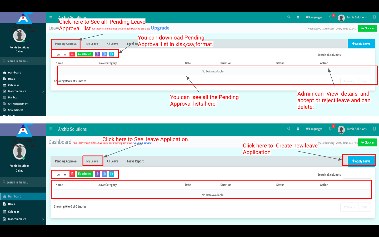 If you are Admin or Department Head then you can access Pending Approval, All Leaves, My Leaves, Leaves Report, Apply Leave and you can create Leave category.