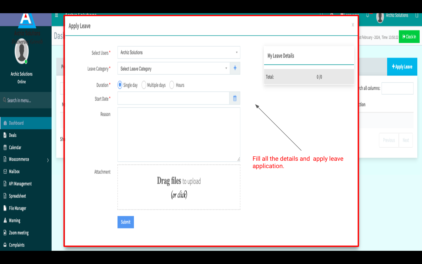 You can also Apply a New Leave Report. Fill up all info and click “Submit” to Submit the Leave report.