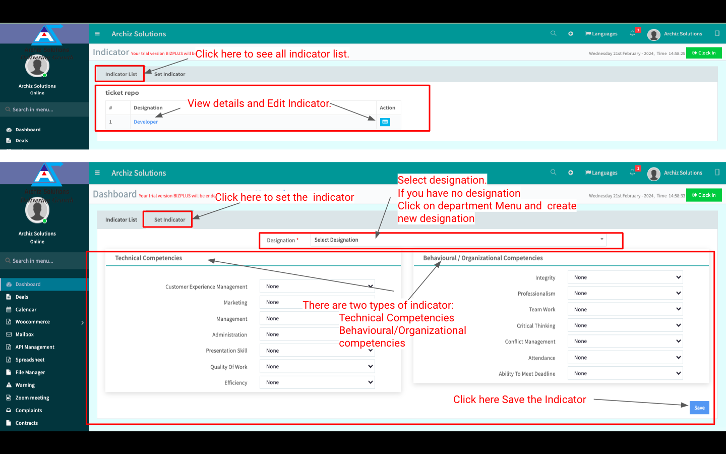 You can Set a New Indicator by clicking “Set Indicator” beside “Indicator List”. There are two types of the indicators: 1. Technical Competencies, 2. Behavioural / Organizational Competencies. Fill up all info and click “Save” to Set the New Indicator.