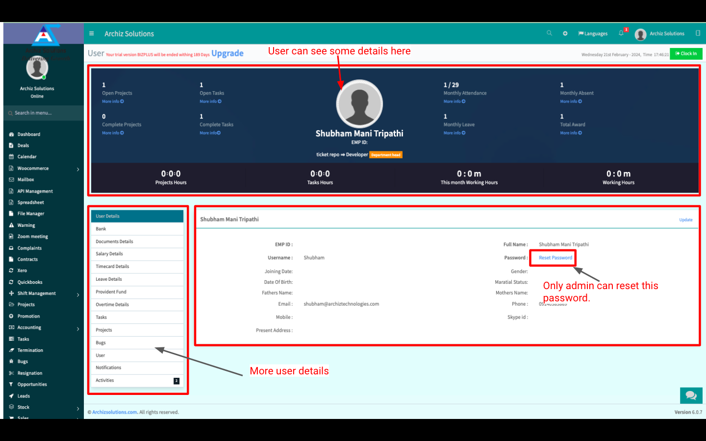 There are more details for user Basic Details, Bank Details, Documents Details, Salary Details, Leave Details, Provident Fund, Overtime Details, Task, Projects Report, Bug Report and all Activity.