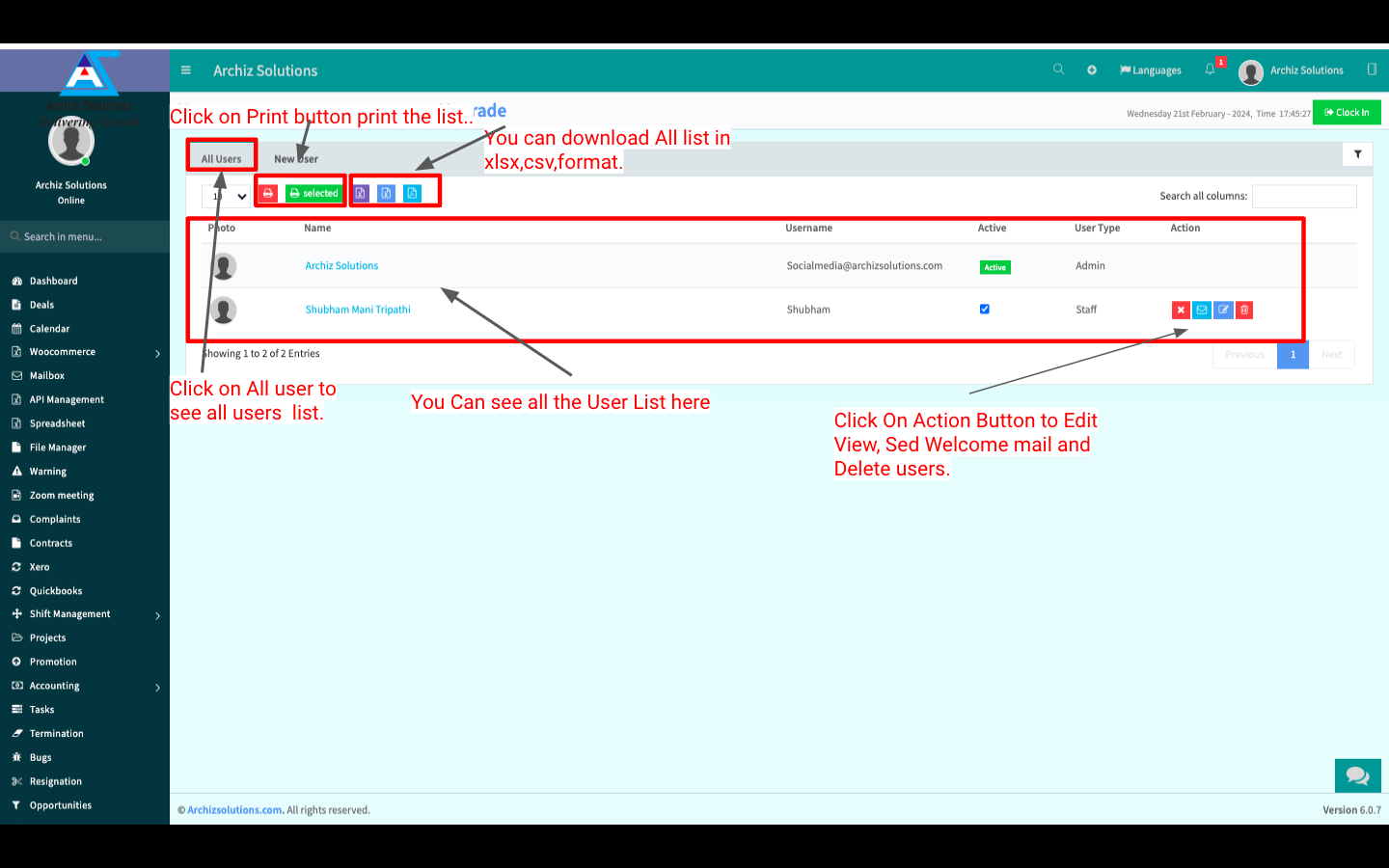 As an admin, he can see all User, Create User, Edit User, Delete User, Banned/Unbanned a User, Download, Print and View User Details.