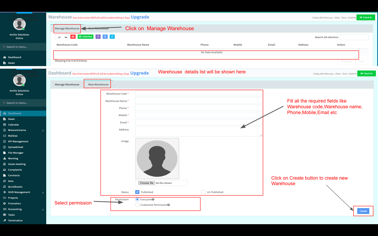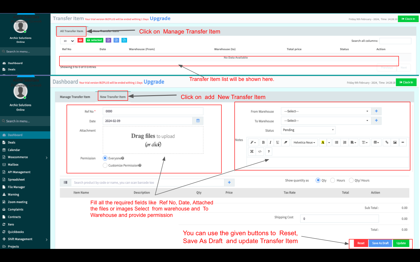 Fill in all the required fields like Ref No, Date, Attached files or images Select from warehouse and To Warehouse and provide permission.