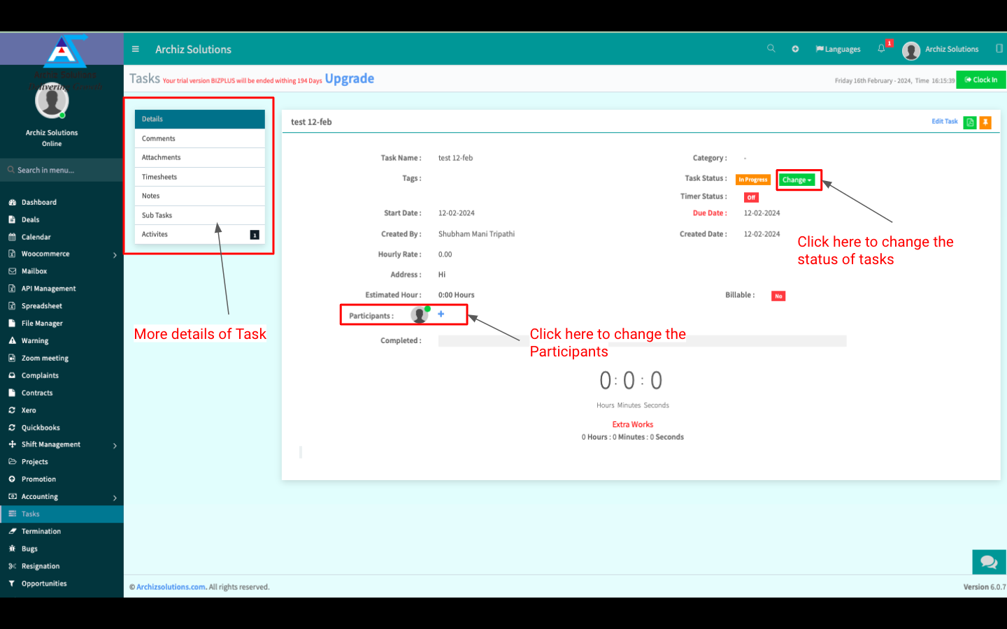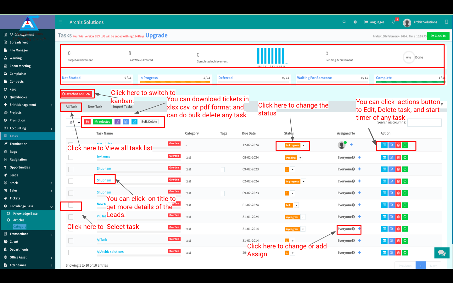You can also Create a New Task, Print, Change Task Status, Change Assigned, or Add New Assign. You can download all tasks in XLSX, CSV, PDF format. You can also Edit, Delete, or Start Timer of an existing task.