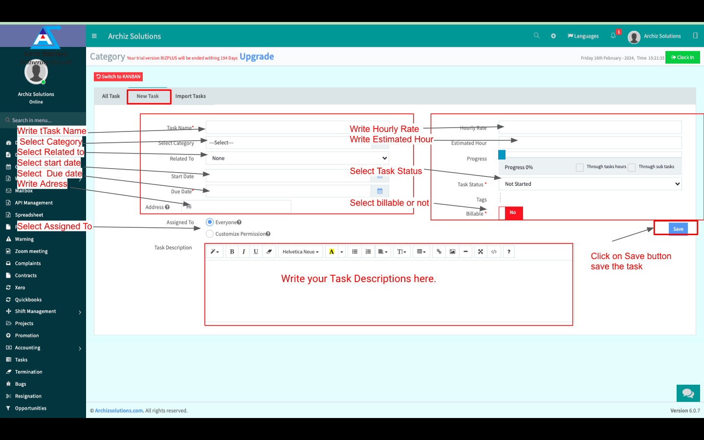 You can also create a New Task. Enter Task Name, Select Category, Select Task Related To, Set Task Start & End Date, Set Hourly Rate, Set Estimated Hour, Select Progress, Select Task Status, Enter Task Tags, Write Task Description, Enable or Disable Billable Button, Select Task Assigned To and Click “Save” to save the New Task.